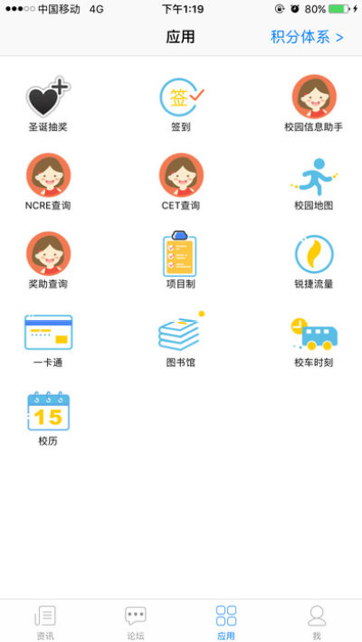3.应用:二级、四六级、研究生奖助金、锐捷流量、一卡通、图书馆查询,校园地图,校车时刻,校历,项目制(随时获取校园活动动态)