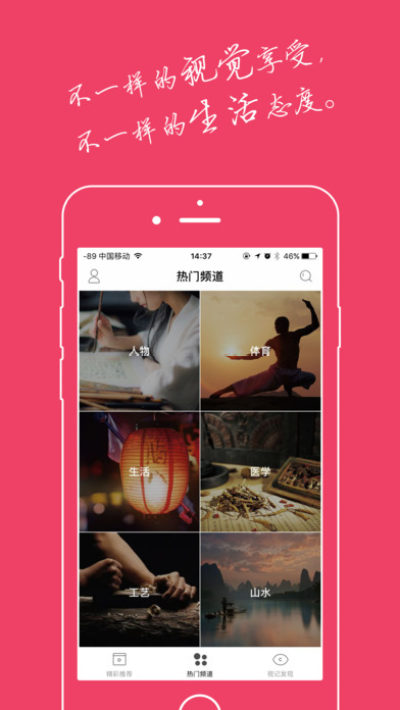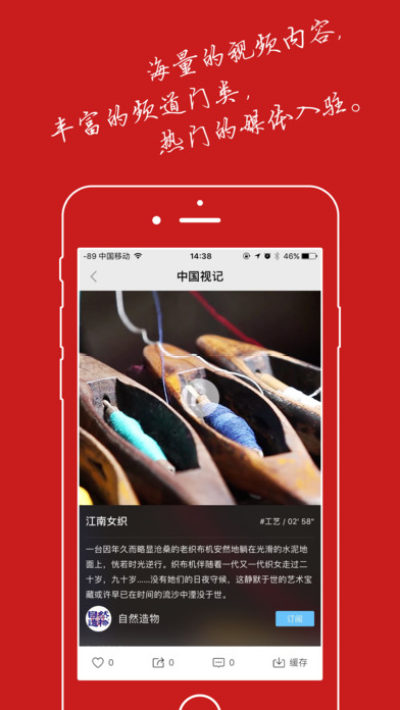 中国视记ChinaSight,是北京华夏视记国际文化传媒有限公司开发的一款非常精致的手机资讯生活服务app,“一小时了解中国,一小时融入世界”为它的设计宗旨理念,只做中国最好的新闻媒体发布平台。该平台包含戏曲、人物、工艺、美食等精选文化频道,汇聚知名新媒体影视制作机构和独立制作人,为国际用户呈现中国文化视听盛宴。