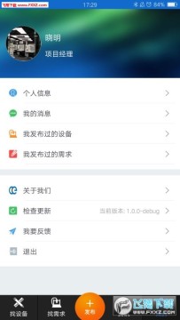 1.界面包括个人信息、我的消息、我发布过的设备、我发布过的需求、关于我们、检查更新、我要反馈、退出等选项,如图: