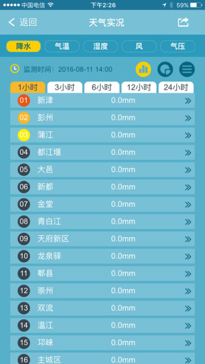 —天气实况:根据手机定位获取当前所在区县级天气实况,展示当前所处位置的气象实况资料(气温、降水、湿度、风、气压),支持成都地区300多个观测站气象实况资料的图形化显示和对比;
