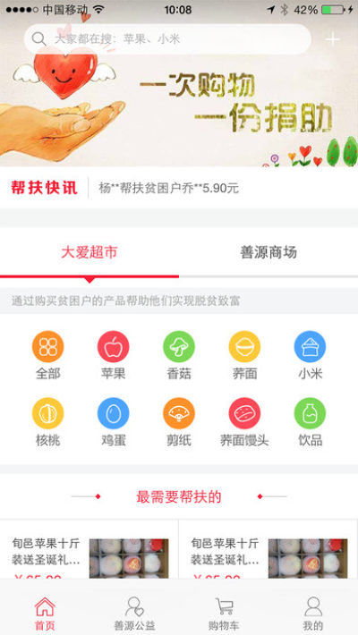 中国银行与中国最成熟的企业公益服务平台“一起善源”联合推出的“公益中行一起善源”精准扶贫应用。汇集贫困地区上万家贫困户,当地贫困户、扶贫电商和农村合作社等可以通过本APP展示农副产品,中行员工与普通用户都可以通过本APP与贫困户结对子,通过购买贫困户的产品对其进行帮扶。贫困户也可以通过本APP购买自己所需的产品。