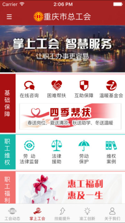 职工只要下载该APP,即可一键享受“工会动态、基础保障、组织建设、职工维权、职工福利、职工健康、技能提升、渝工创新、阵地导航、工会导航”十大类的专业化服务,并可实现随时随地找组织、找服务、找援助、找义诊、找活动、找实惠、找专家、找培训等。