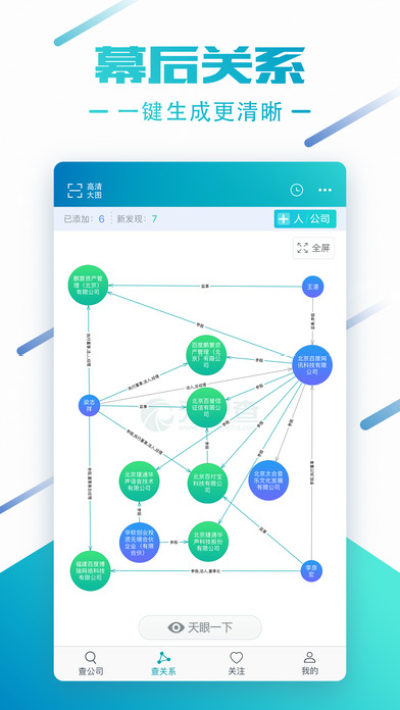 「天眼查」是目前业界唯一一个能提供关系发现功能的产品,用户在天眼查专业版中输入某个人名或者企业名称,就可以看到该主体下所有关联体的直观呈现以及更多隐藏在背后的商业利益关系,并自动形成关系图。这位媒体、金融、政府等机构开展商业调查节省了大量时间和沟通成本。用天眼查制作的企业关系图频频出现在各个报道之中。