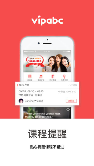 vipabc青少年英语app官方版是一个为小初高等学生推出的全方位的英语学习锻炼手机app,其动态课程能够更加智能化的根据每位学生的学习习惯、学习兴趣来选择将要学习的课程,需要的用户快来下载vipabc青少年英语手机客户端吧。