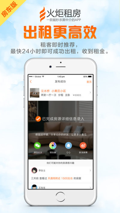 这是火炬租房的房东版本,如果你手上有房子需要租出去的话可以直接通过它来发布房源信息,支持在线回复客户的消息和在线管理房源,对于帮助你将房子快速租出去是很有帮助的,而且还可以省去中介费用,欢迎有需要的朋友来这里免费下载使用!