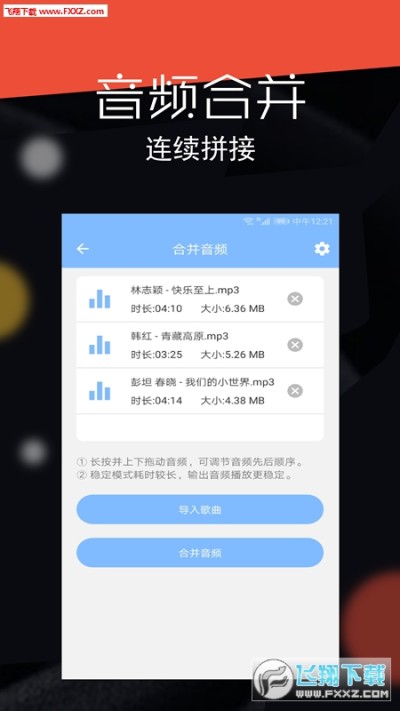 2、音频合并:各类音频,无缝合拼接合成,编辑自己喜爱的音频铃声MP3;