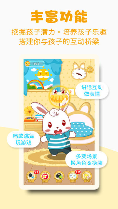 《兔小贝》是一款辅助儿童乐学乐教的陪伴式APP,它可以在您触摸时讲话、做动作、唱儿歌、跳舞、讲故事、背唐诗;并持续更新日常行为习惯等场景游戏,让宝宝在游戏互动中,学习并掌握日常行为规范,培养孩子的好习惯、好性格,提升宝宝的观察力和逻辑思维。