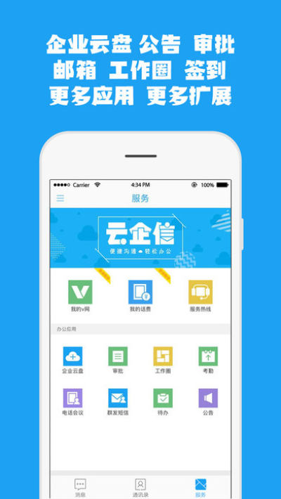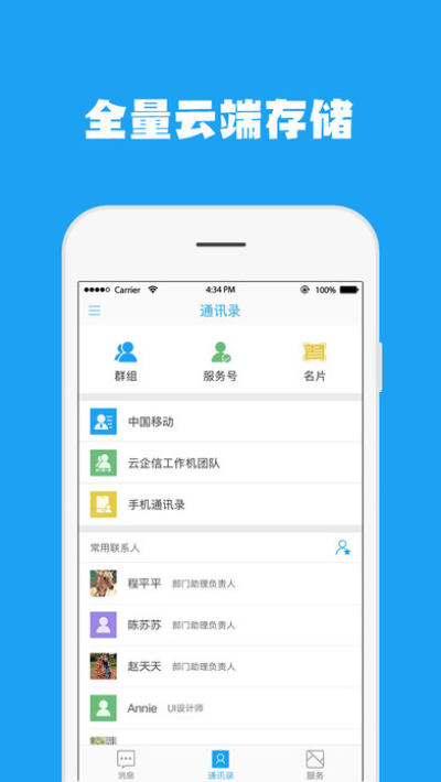 云企信app是一款=由中国移动官方推出的手机移动企业办公通讯客户端,这款软件提供给企业更加高效有效的办公功能,超大通讯录涵盖企业所有员工,还有云搜索,网络电话会议也可以在这款软件上开,非常方便,需要的用户赶紧来试试吧!