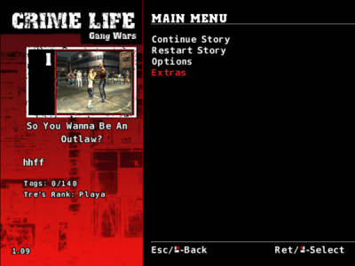 玩家在游戏中极力实施“暴力之道”,游戏也以“自由且横行无忌的罪恶”为基础,玩家在游戏中扮演的是美国街头黑人少年帮派的一名无名小卒Tre,平时所乾的事就是打打台球,练练射击,或是跟敌对的帮派打打群架。游戏中人物的造型非常贴近于现实,从服饰到饰物都非常符合黑人帮派文化。