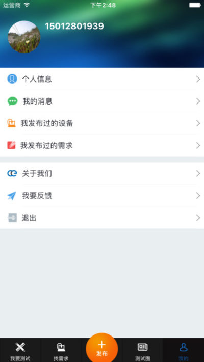 1.界面包括个人信息、我的消息、我发布过的设备、我发布过的需求、关于我们、检查更新、我要反馈、退出等选项,如图: