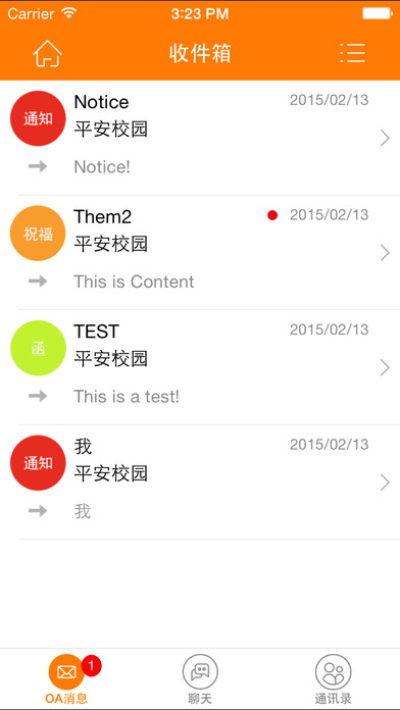 OA信息:支持图片、表情、文字的发送;收到固定群内好友的信息。