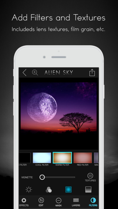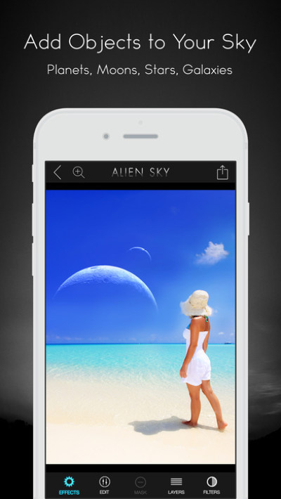 Alien Sky,来自打造了Lens Light和Lens Flare两款优秀特效App的开发小组BrainFeverMedia。这次的Alien Sky可以为你的照片创建出奇换的星球效果。