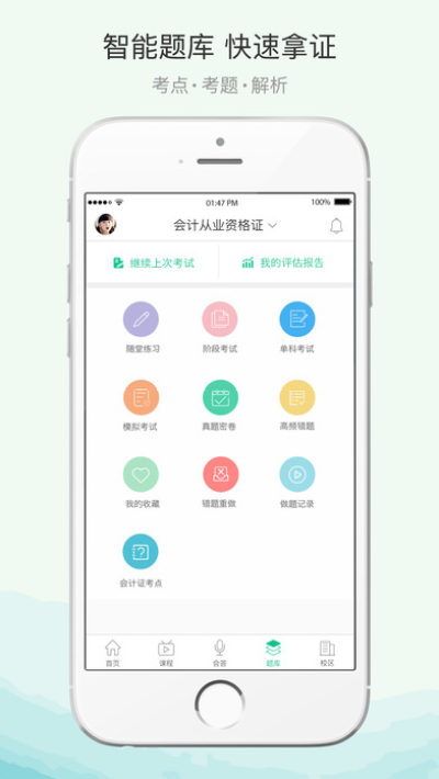 3.智能题库:12种题库(会计证、初级、中级等)类型,8大训练模块,海量真题。