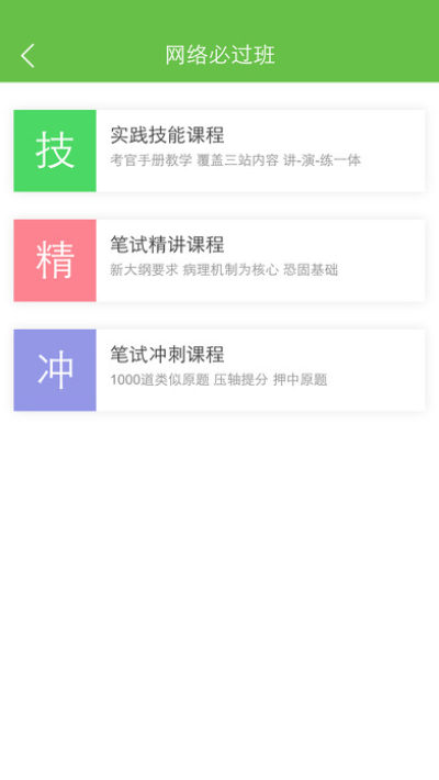 三、多课程切换:符合医院上班族的人群使用习惯和工作环境,采用医学个性化界面设计,医生碎片化时间多,触摸右上角的图标即可自由切换不同类别的课程,比如你今年考执业医师,又考执业西药师,那么你就可以快速切换不同类别的课程,避免多账户在同一台手机上使用不方便的操作。