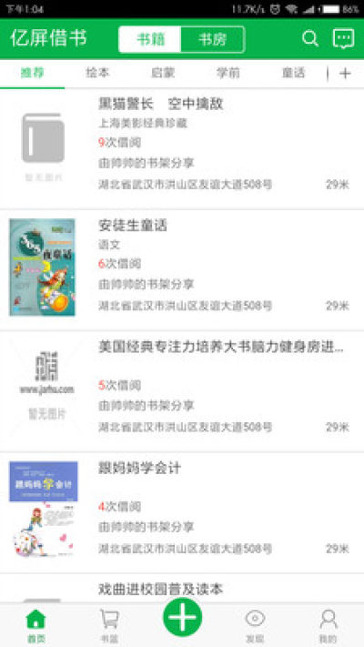 基于位置信息的家庭图书共享平台,共享自己的闲置图书让附近有需求的人线上查询并下单,线下借阅。扫描家庭图书封底的条码将图书上传到平台,对家庭藏书进行信息化分类管理,闲置的书设为共享让附近的人借阅,每本书借阅一次获得0.8元购书补贴。也可向附近的家庭借阅图书,每本书每次借阅支付1.0元借阅费,可借阅30天。图书看完后只需在手机上点击“还书”即可,图书等待下一个借阅者从你家再借走。