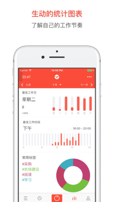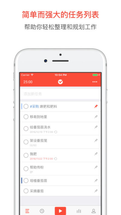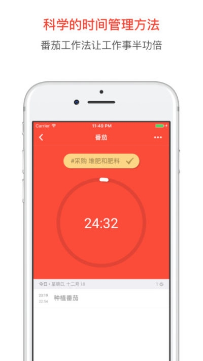 在完成任务的横向管理后,重心则转入到纵向执行层面,将任务按执行顺序排序,点击按钮,开始你的第一个番茄时间吧!一个番茄接着一个番茄,一个任务接着一个任务,享受执行折快感吧!