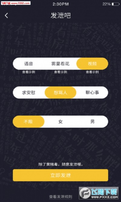 进入主页面,点击“我要发泄”下单。下单前有三种模式(语音、雾里看花、高清视频)、三种需求(求安慰、想骂人、聊心事)可供选择,对发泄对象亦可以选择性别。