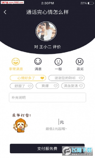 发单者发泄完毕之后,需要打赏至少1元的服务费(推广期间);发单者中断服务,依然需要支付服务费,请求加时1分钟,需额外支付0.5元。