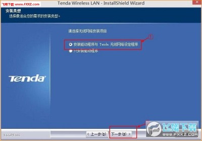 3.在随后的页面中选择“安装驱动程序与Tenda无线网络设定程序”点击“下一步”