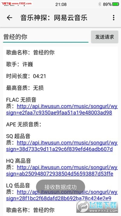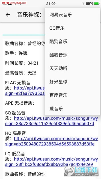 全局搜索:打开应用直接搜索歌曲名称,会弹出很多歌曲的详细信息,其中就有下载链接,复制链接下载即可。