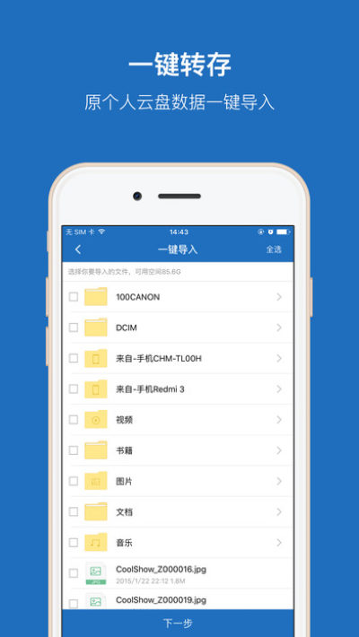 原个人云盘数据一键导入,文件再多也会在分分钟内导入。再也不用苦苦等待下载了!