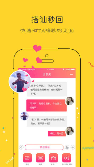 一个人的夜晚总是孤枕难眠? 想玩的夜里找不到人陪? 总让寂寞占据你的内心? 在这里,这些统统不用担心! 让你孤独的夜里,有人陪,不孤单! 寂寞之夜一个人怎么行!在这里,不闲聊,约你出来,寻欢作乐! 约吗是时下用户质量非常高,约会效率非常快的一款移动应用,没有之一。