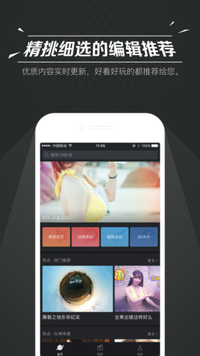 【裸眼VR】全兼容高清播放器,支持手持操作,移动手机或者滑动屏幕均可以调整视角,让没有VR设备的您也能畅享VR。