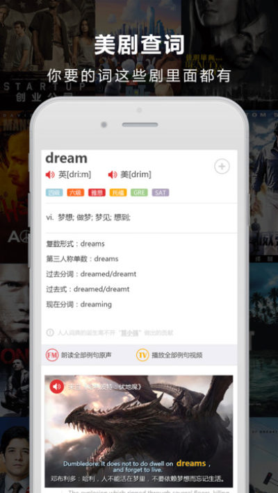 喜欢看美剧的朋友肯定熟悉“人人影视”,“人人词典”是“人人影视”字幕组旗下产品。只要搜索任意单词,它会显示这个单词在哪部电影/电视剧出现过,哪个明星的台词,并提供相关视频截图,双语上下文、影视原声、视频片段等让你学习英语不再枯燥。