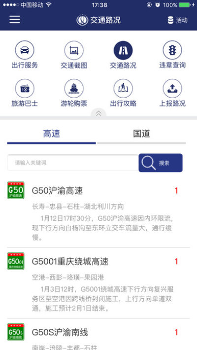 “交通路况”板块,涵盖了重庆区域内高速公路及国省道的及时文字路况。