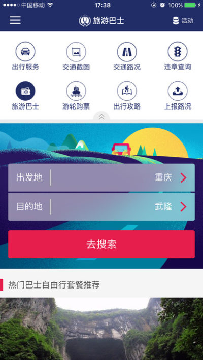 重庆交通APP集路况、公交、轨道、长途、出租车、铁路、航班、轮船、旅游自驾等服务功能于一体。包括了“出行服务”、“交通路况”、“路况上报”、“出行攻略”、“交通截图”、“游轮票务”、“失物招领”、“旅游巴士”八大功能板块。