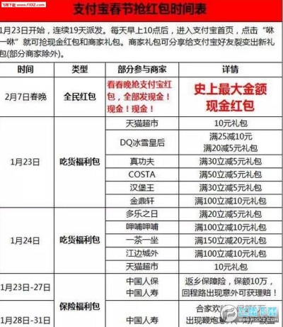 2017春节抢红包日历完整版已经正式上线,用户通过此资料可以看到最新的2017年春节抢红包活动时间,今年qq、微信、支付宝、微博等各种红包活动非常的多,不想错过一个亿的小伙伴们快来根据这个日历开始抢红包试试吧,还有精彩春晚节目单,等你来看哦。