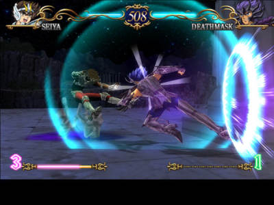 超必杀分三等,分别要消耗1、2、3条小宇宙槽(第七感发动时可无限使用),发动动作均带防御崩坏效果(鸡肋),LV2超杀的发动动作带护身效果,LV3的发动动作有一定无敌时间,可以穿过某些飞行道具。进入超杀动画之后,在一定时间里会随机出现一个按键,防守方如果在按键图标出现的时间内准确按中的话就进入角力状态,攻击方不断按4个按键增加出力槽,防守方按照画面边缘不断落下的按键输入指令,防守方一旦输入错误则告防守失败,要吃下超杀攻击,防守方在10秒时间里不出错则代表反击成功,会以LV1超必杀反击(我到现在都没有成功过,OTL,几乎可以说是电脑专用……)。被超必杀打倒将不能复活,直接KO。