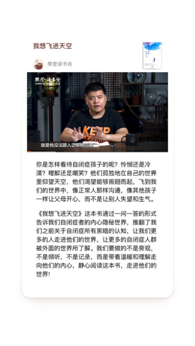 通过樊登读书会APP、樊登读书会公众号、订阅号等多种移动互联网工具,为会员展示了丰富的线上精华解读。此外,我们深谙“独学而无友则孤陋而寡闻”,因此我们还致力于为会员构建以书会友的线下阅读社区,通过形式多样的书友沙龙活动丰富会员的日常生活,为会员打造全新的生活方式。《樊登读书会》是一个名字叫樊登的人做的知识性脱口秀节目,类似于罗辑思维