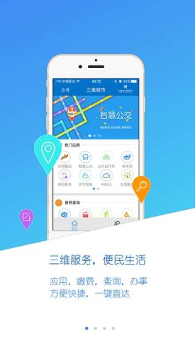 实时路况、智慧公交、公共自行车、停车场、预约挂号、天气预报、资讯频道、社区服务、PM2.5、社区医院、航班查询、火车票、畅游兰州、信访大厅。