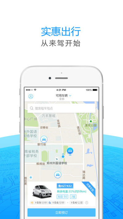 来驾租车app是一个手机租车软件,在城市的各处都停有电动汽车,当你需要汽车的时候只需使用该app就能完成整个租赁过程,非常的方便,能为你的出行节约不少的时间,有需要的朋友快来免费下载体验吧!