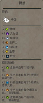 (注:优点,前期没有研发出种植园等技能的情况下,可以超前获得普通资源的粮食加成和全部奢侈品的宜居点加成,并且关联天朝特性,普能资源加成亦能提供宜居点加成.前期发力迅猛.