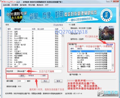 软件清粉速度很快,可以自己编辑发送的内容。软件是最新版,长期自动更新。下载时候会报毒,是易语言开发的,请关闭杀毒软件,放心下载。点有下角登录,扫二维码登录微信,开始清粉。