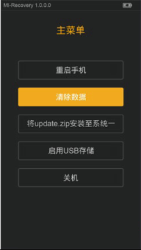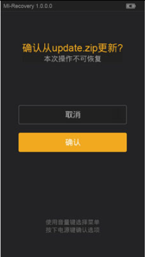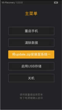 4:三清之后,回到recovery主界面,选择将update.zip安装至系统一并确认,选择确认等待完成,选择重启系统即可。