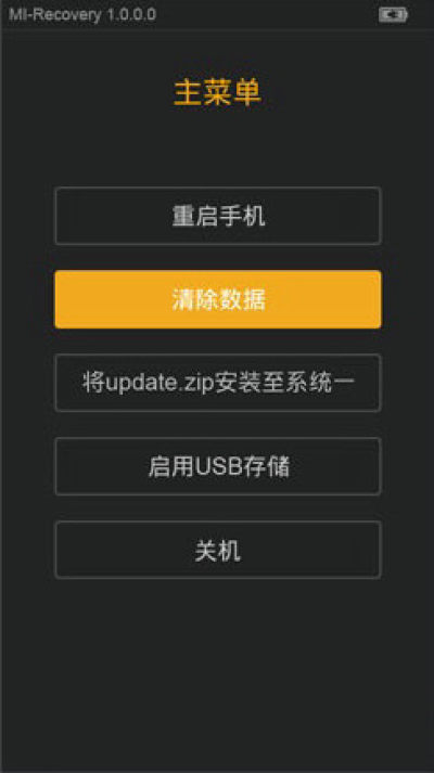 3:选择简体中文并确认,在recovery界面里 音量键表示选择 电源键表示确认,咱们用用音量键选择第二个,清除数据,按一下电源键确认进入,然后用音量键选择上方三个清空的选项,这就是三清,按电源键确认,依次清除。