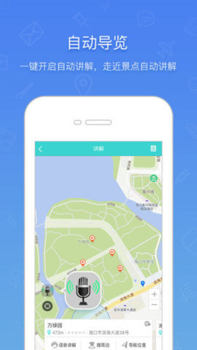 点击自动导览,景点讲解进入讲解地图界面,点击小喇叭进入导览状态,用户持手机进入景区范围,自动出现讲解点,距离讲解点20米左右自动开始语音讲解。