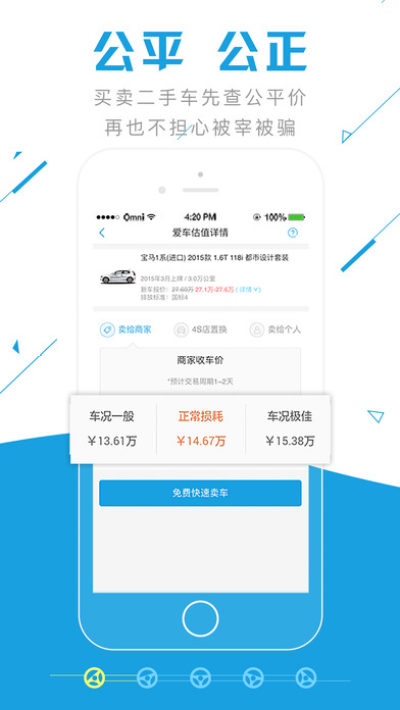 公平价是独立第三方二手车估值平台 ,累计为1500多万用户提供专属爱车估值服务。为超过100多个二手车交易平台、拍卖平台、二手车经销商提供二手车报价服务。公平价,是行业公认的第三方二手车评估报价平台。