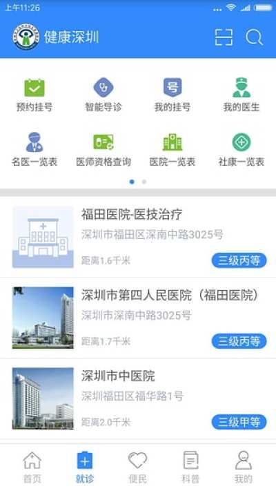 健康深圳网app是一个让用户可以直接在手机端查看不同医院地理位置、医师资格等信息的应用软件,来支持手机挂号哦,排队更加方便,还有之智能导诊服务平台,需要的小伙伴们快来下载深圳健康网手机版软件试试吧。