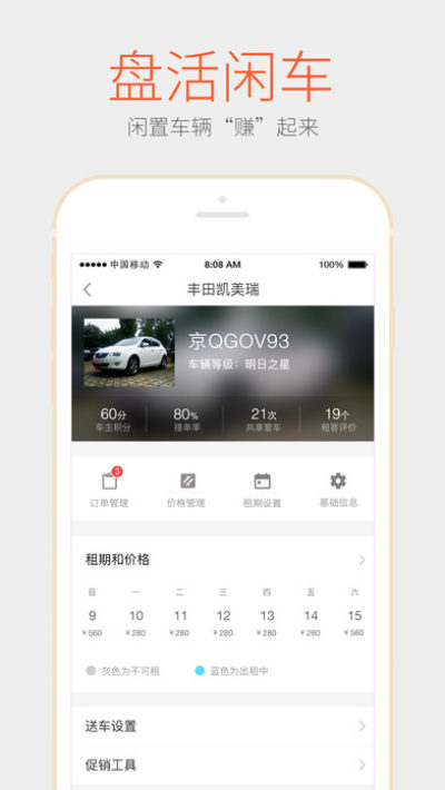手机租车App一键响应订单,想放租就放租, 月赚3000+以上收入,轻松赚回养车钱,租客实名认证、信用卡验证,严谨风控防护,租客需额外购买435万责任险,不损原车险KKBot智能车辆管理,车辆状况一手掌握,只要将车停放在任意一个停车场就行,需要垫付停车费,2天后报销,但是有用车区域限制,