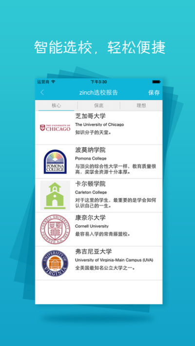 Zinch中国拥有准确、详实的海外院校库,通过用户个人提供的海外院校排名、TOEFL/ IELTS与SAT成绩、意向专业等众多搜索条件,帮你拨开迷雾,提供极具针对性的个性化院校名单,帮助你轻松便捷地找到适合的海外院校,踏出坚实的第一步。