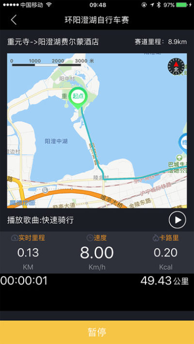软件将开始计时,同时采集单车传递过来的速度。软件中会有音乐陪伴锻炼的过程,也可以选择将音乐关闭。软件将会统计运动的里程数据,如需要退出运动,可以点击暂停和退出按钮。总里程数将会被保存在数据库中。