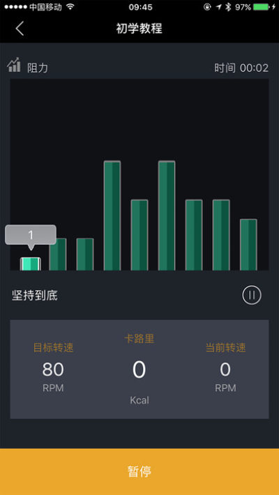 课程训练中分别编排了对应的骑行速度,骑行的阻力和骑行的时间。因此在骑行的过程中,APP会对动感单车的阻力调控系统进行控制。柱状图矩阵分别对应了相应的阻力控制情况,和要求使用者达到的速度指标。因为变速和变阻骑行在业界被认为是相对有效的训练方式。因此使用者是否达标代表了他的运动效果。