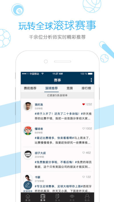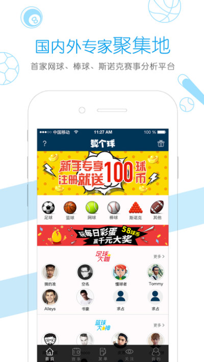 这里有玩足球、篮球、网球、斯诺克命中率高达85%以上的高手分析师。每天千余位分析牛人在app内交流心得,成为国内首屈一指的小球类专家孵化器,只要你够牛,下一个分析师就是你!