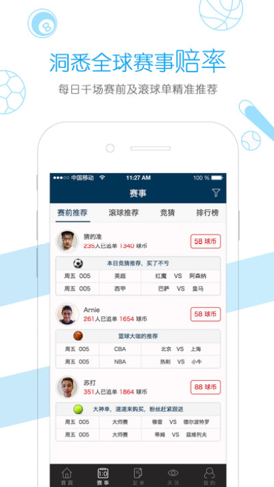《算个球》APP,首款集足球篮球,网球,斯诺克,棒球等小球类赛事分析和推荐的软件。