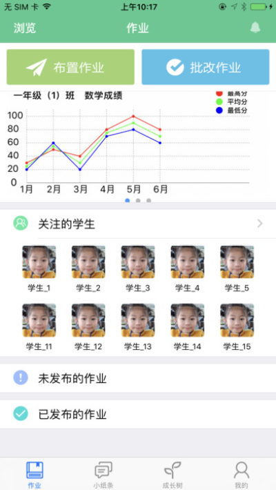 3.快捷布置作业:老师可以在作业列表按照发布和未发布分类查看布置的所有作业内容,可查看作业详细内容、查看截止日期、提交学生的数量、重新发送给学生、查看统计结果、查看家长签字情况。可按班级和科目分别查看作业预警,老师可在移动端发布通知性作业。