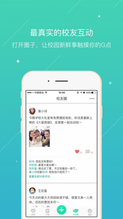 代送:取快递,送物品,发布代送代拿信息 代购:买外卖,购零食,买鲜花,校友帮你购 代办:办事情,帮打印,麻烦事情统统搞定 校友圈:去聊天,去点赞,去分享